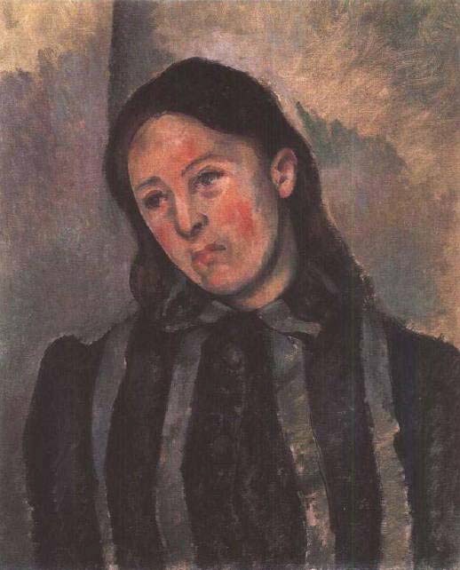 不过,即使是我们的插图,至少也还能部分地表现出塞尚取得的巨大成功。这是法国南部圣维克托山(Mont Sainte-Victoire)的风景(图350),它浸沐在光线中,然而稳定、坚实。它呈现了清楚的图案,但又使人感觉到有巨大的深度和距离。塞尚标示出位于中央的旱桥和道路的水平线和前景房屋的垂直线,这种方式有一种秩序感和恬静感,但是我们并不感觉到那是塞尚强加给自然的一种秩序。甚至他的笔触也安排得跟画面的主要线条一致,加强了画面的自然的和谐感。塞尚无须借助于勾画轮廓线就能改变笔触的方向,这种方式也能在我们的图351中看到,图中表现了艺术家是多么有意识地强调前景中岩石的坚实的实体形状,借以消除上半幅画中本来可能出现的平面图案的扁平效果。塞尚画的他妻子的奇妙肖像(图352)表现出他一心注意简单的、轮廓分明的形状多么有助于画面给人平稳和沉静的感觉。跟这样平静的名作相比,像马内的莫奈肖像(见518页,图337)那样一些印象主义作品往往看起来纯属机智的即兴之作。