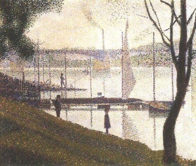 在塞尚摸索着对印象主义手法和画面有秩序的要求进行调和的时候,一位年岁小得多的艺术家乔治·修拉(Ceorges Seurat, 1859-1891)却几乎把这个问题当作数学方程式来着手解决。他从印象主义绘画方法出发,研究色彩视觉的科学理论,决定用非混合色(unbroken colour)的规则小点像镶嵌画一样组成他的画。他指望这就能使色彩在眼睛里(或者更确切地说是在头脑里)混合起来,而不失去强度和明度。但是这一种被叫做点彩法(pointillism)的技术是一种极端措施,它去掉了所有的轮廓,把每一个形状部分解成彩色小点构成的区域,自然使形象难以辨识:于是,修拉不得不设法补救他的绘画技术的复杂性,对形象进行根本的简化,比塞尚所曾设想的一切还要简单(图354)。修拉强调直线和水平线,几乎有埃及艺术风味,这使他越来越远地离开了忠实地描绘自然面貌的道路,走向探索有趣的、富有表现力的图案的道路。