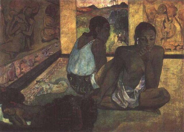 1888年在法国南部还能见到第三位艺术家,他就是保罗·高更(Paul Gauguin, 1848-1903),他的情况跟前面两个人很不相同。凡·高非常渴望知音,他梦想有一个像英国的前拉斐尔派所建立的那种艺术家兄弟会(见511-512页),他说服了年长5岁的高更与他在阿尔勒合伙。高更这个人跟凡·高大不一样,他根本不像凡·高那样谦卑,也没有他的使命感。相反,他自视甚高,雄心勃勃。但是两个人之间仍有一些共同之处。高更跟凡·高一样,也是年岁较大才开始作画的(他过去是富有的证券经纪人);而且也像凡·高那样,几乎是自学。但是两个人的友谊关系却以不幸而告终。凡·高在发疯时打了高更,高更就跑到巴黎去了。两年后,高更索性离开欧洲,到了众所周知的“南太平洋诸岛”,在塔希提岛(Tahiti)上寻求简朴的生活。因为他已经越来越相信艺术处于华而不实的危险之中,欧洲已经积累起来的全部聪明和知识剥夺了人的最高天资——感情的力量和强度,以及直接表现感情的方式。