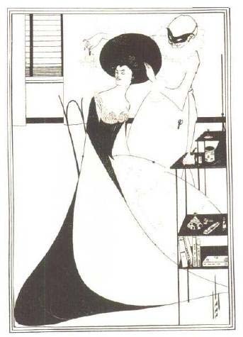 同样,插图艺术也从这种效果的发展中获益。像威廉·莫里斯(见535页)那样的人,记得以前的人们在印书上所倾注的爱心和精心,决不容忍那些只管讲故事不管印刷效果的印制粗劣的书籍和插图。年轻的奇才奥布里·比亚兹莱(Aubrey Beardsley, 1872-1898)从惠斯勒和日本画家那里汲取灵感,以他绝妙的黑白插图(图362)在整个欧洲一跃成名。