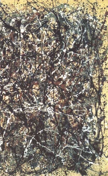 于是,这里就是绘画的一个似乎还没有被探讨的方面——纯粹用色,不考虑任何内在的动机或目的。在法国,对于笔触留下的印迹或墨点的专门研究叫做tachisme(斑点画法),此词从tache(斑点)而来。以新奇的用色引起大家注意的画家,最突出的是美国艺术家杰克逊·波洛克(Jackson Pollock, 1912-1956)。波洛克曾经沉迷于超现实主义,但是他逐渐抛弃了在他的抽象艺术习作中经常出现的那些怪异形象。他对因袭程式的方法感到厌烦以后,就把画布放在地板上,把颜料滴在上面,倒在上面或泼在上面,形成惊人的形状(图393)。他可能记得已经使用这种打破常规画法的中国画家的故事,还记得美洲印第安人为了行施巫术在砂地上作画。这样产生的一团纠结在一起的线条正好符合20世纪艺术的两个相互对立的标准:一方面是向往儿童般的单纯性和自发性,那就使人想起连形象还不能组成的幼小孩子们的乱画,与此相对,另一方面则是对于“纯粹绘画”问题的高深莫测的兴趣。这样,波洛克就被欢呼为所谓“行动绘画”(action painting)或抽象表现主义(Abstract Expressionism)的新风格的创始人之一。波洛克的追随者并不都使用他那么极端的方法,但是他们都认为需要听从自发的冲动。他们的画跟中国的书法一样,必须迅速完成。它们不应该事先计划,应该跟一阵突如其来的自行发作一样。没有什么疑问,艺术家和批评家之所以提倡这种方法,事实上不仅是受到中国艺术的影响,而且也完全受到远东神秘主义的影响,特别是那种以佛教的禅宗为名在西方流行起来的神秘主义。这个新运动在这一点上也继续着较早的20世纪的艺术传统。我们记得康定斯基、克利和蒙德里安就是神秘主义者,他们想突破现象的帷幕进入更高度的真实(见570页,578页,582页);我们也记得超现实主义者企求“神性的迷狂”(见592页)。没有被惊得失去思维推理习惯的人谁也不能对此大彻大悟,这一点正好是禅宗教义的一部分(虽然不是最重要的一部分)。
