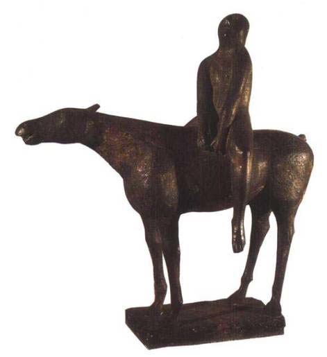 战后这一时期,另外一些艺术家被一个萦回在他们心头的形象吸引住了。意大利雕刻家马里诺·马里尼(Marino Marini, 1901-1980)用战时留在他脑海里的一个母题创作了许多变体的作品,因而闻名于世。这个母题是粗壮的意大利农民在空袭时骑着农场的马逃离村庄的情景(图398)。在这些焦急的人物和诸如韦罗基奥的《科莱奥尼》(见292页,图188)那类的传统英雄骑马像之间形成的对比,使这些作品具有一种奇特的悲怆性。