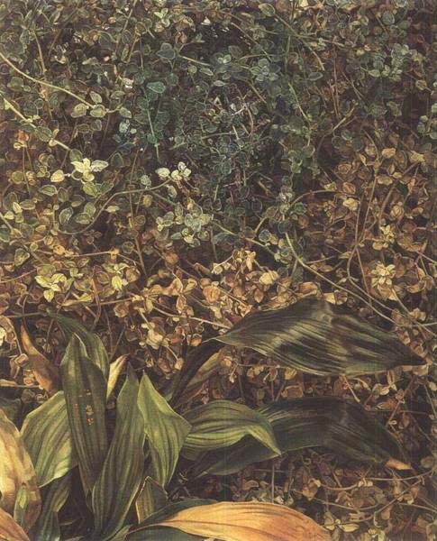 今天,那些享有这种新发现的多样化权力的艺术家并非全都接受“后现代”这个标签。正是这个原因,我才宁愿讲“一种转化的心境”而不愿讲一种新风格。我在上节强调指出,将各种风格设想成像“士兵游行”那样互相接续而来,总易引起误解。不可否认,阅读艺术史著作的人和撰写艺术史著作的人都喜欢这样整齐的排列,但是如今人们更加普遍地认识到艺术家有权走自己的路。这样,“如果今天有人要找个斗士,那就是回避了造反者架势的艺术家”(见610页),这话在1966年适用,而今就失效了。一个突出的例子是画家卢西安·弗洛伊德(Lucian Freud, 1922-),他从不反对研究自然形象。他的画《两种植物》(Two Plants)(图403)也许使人想到丢勒作于1502年的《野草》(见345页,图221)。他们的画都表明了艺术家专心致志地表现普通的植物之美,但丢勒的水彩画是供自己使用的画稿,而弗洛伊德的大幅油画却是现在挂在伦敦塔特美术馆的一件自身独立的作品。
