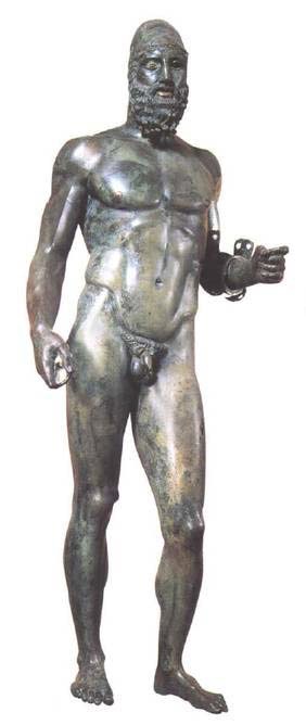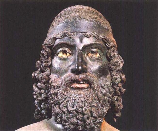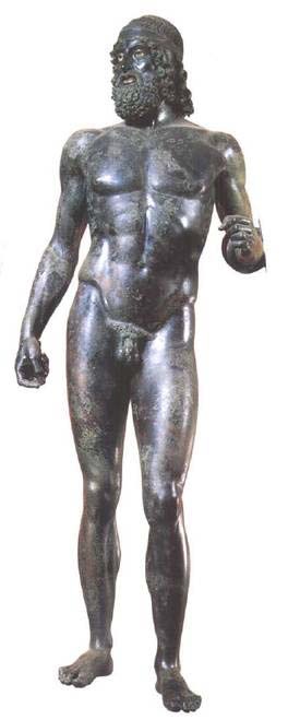 在讨论古希腊的伟大的发现时期时,我曾切望读者注意我们对希腊艺术的描绘有些失真,因为我们要想了解出于米龙之类大师之手的著名青铜雕像,就不得不如此信赖后来为罗马收藏者制作的大理石摹品(见91页,图55)。正是因此,我才选用镶着眼睛的德尔菲驭者头像(见88-89页,图53、图54),而不用更著名的作品,以免读者认为在希腊的雕刻之美中有些缺乏感情。同时,1972年8月一对雕像从靠近意大利南端的里阿斯(Riaoe)村旁的近海中被打捞上来,它们能更加有力地证明这一点(图408、图409),这两尊英雄或运动员的等身大青铜雕像,想来一定是被罗马人用船从希腊运来的,大概是遭遇风暴之灾被抛在那里。考古学者对它们当初可能出于何时何地还没有最终定论,然而它们的模样已经足以向我们展示它们的艺术性质和感人的活力。它们那肌肉丰满的身体和胡须浓密的头部(图407),其造型技术我们绝不会看错。艺术家表现眼睛和嘴唇,甚至还有牙齿都使用其他材料制作,其精心从事可能已使一些希腊艺术爱好者瞠目结舌,他们总是期望看到他们所谓的“理想”形象;然而跟一切伟大的艺术作品一样,这两尊新发现的雕像也驳斥了批评家的一些信条(见35-36页),成功地表明了我们对艺术越加概括就越容易出错。