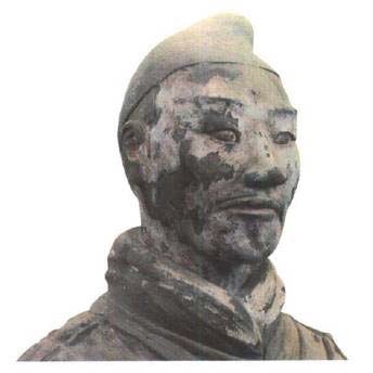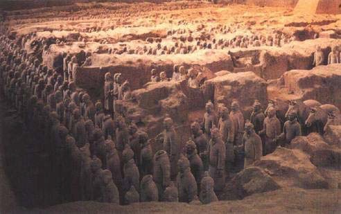 这位强大的马其顿国王施行政策,实际为他的儿子亚历山大大帝的辽阔帝国奠定了基础。当我们听到上述有关他的陵墓的消息的时候,在中国北部的西安市附近,考古学家们也做出了一桩极为惊人的发现,那里靠近一位更为强大的统活者的陵墓——那是中国的第一位皇帝,其名称常常拼做Shi Hwang-ti(始皇帝),中国人现在愿意我们称之为Qin Shi Huangdi(秦始皇帝)。这位强大的军事首领在公元前221年到210年统治中国(约在亚历山大大帝之后100年左右),历史学家认为他是首次统一中国的人,而且他还修建长城保卫国土,以防西边的游牧民族入侵。我们说“他”修建长城,实际上应该说是他驱使国民建起那道巨大的防御工事——这样讲比较中肯,因为新的发现表明当时必然还有足够的剩余人力,能够艰苦地从事一项更不寻常的事业,制作出现今所称的“兵马俑”(terracotta army),一队队真人大小的陶制兵士(图411)排列在他的陵墓周围,他的陵墓迄今还未打开。