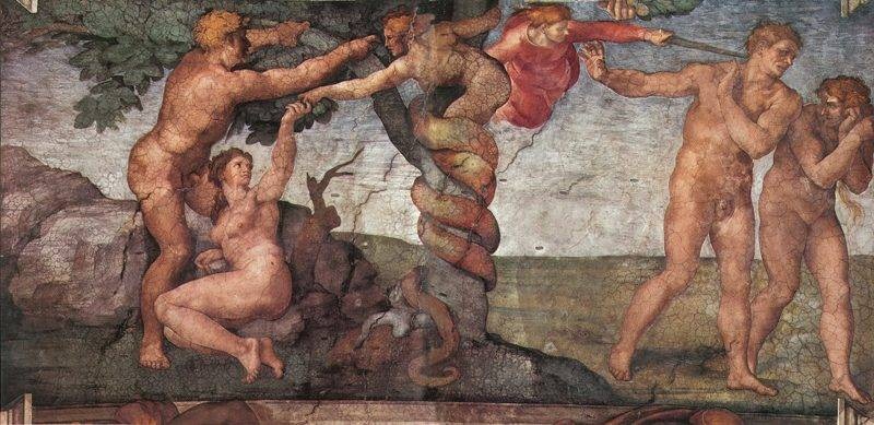 画幅中间以蛇和天使盘踞的善恶树将画面一分为二,右面描写亚当和夏娃在蛇诱导下采摘树上的果实,亚当和夏娃既没有偷食的慌张,更没有违背上帝旨意的犯罪感,这与马萨乔画的亚当和夏娃处于上帝支配的从属地位不同。米开朗基罗认为,人和上帝是平等的,上帝拥有的,人也应该获得,在这幅画中人的地位和价值最终得到确立。画幅左面,天使挥动宝剑将亚当和夏娃逐出乐园,亚当双手握拳,既有拒绝和反抗之意,也有自卫和护卫妻子的状态,夏娃的胆怯是弱女子的本能反映,他们是大踏步地离开天堂,来到人间的。