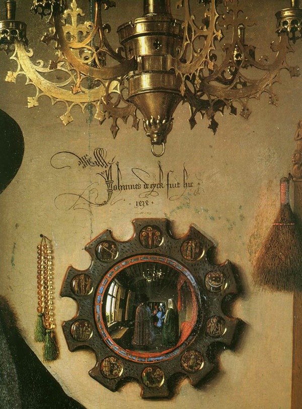 这幅肖像画被认为是“欧洲艺术中第一幅心理肖像画”。画中的主人翁是1420年被菲利普公爵封为骑士的阿尔诺芬尼和他的新婚妻子。阿尔诺芬尼举着右手,表示他将终生养活和热爱他的妻子。这时他的妻子则虔诚地微低着头,伸出右手放在丈夫的左手上,表示永做丈夫的忠实伴侣。画家通过他们的动作、雍容的衣饰、舒适的环境,以及漂亮的吊灯、主人翁脚下的叭儿狗等典型细节的刻画,将这对新兴资产者的生活情趣、内心世界,栩栩如生地揭示在观众面前。画家还有意地在人物背后的墙上画了一面镜子,镜里映出主人翁的背影,也可以看到打开了的房门和门中进来的客人——画家自己的形象。这些受当时流行的细密画风格影响的手法痕迹,不仅给画面增加了空间感觉,也与画家所要表现的新兴资产者的平庸琐碎、虚荣浮夸的精神面貌相一致。