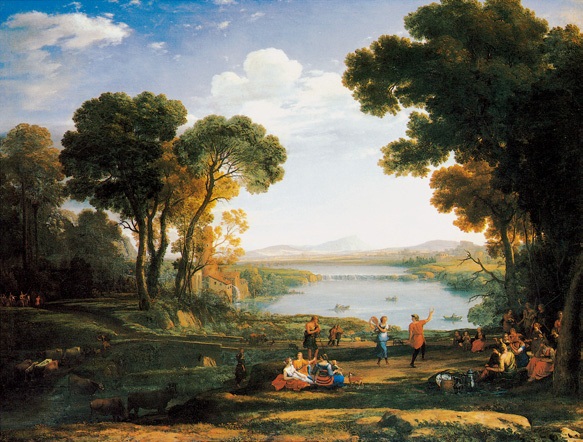 克劳德·洛兰(1600~1682),法国画家。出身农家,长期旅居意大利。擅长历史风景画(具有宗教、神话、文学、历史情节的风景画)。由于久居罗马,没有为法国的学院画风所浸染,使他的风景画能和普桑的作品一脉相承。他革新古典风景画,开创了以表现大自然的诗情画意为主的新风格,对欧洲风景画的发展有较大影响。