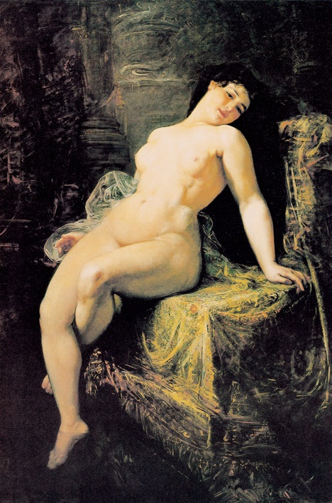 此画以强烈的明暗对比、迅疾的笔触来描绘背景,从而将人体完全地、甚至有些突兀地衬托了出来。画家的重心在于对人体生动的刻画,而背景只是人体的一种铺垫,它的细节是无足轻重的,但正好衬出画家狂放的笔触。人体健美而丰满,既有着现实主义的刻画,又带着朦胧虚幻的浪漫主义色调,应是画家早期作品。