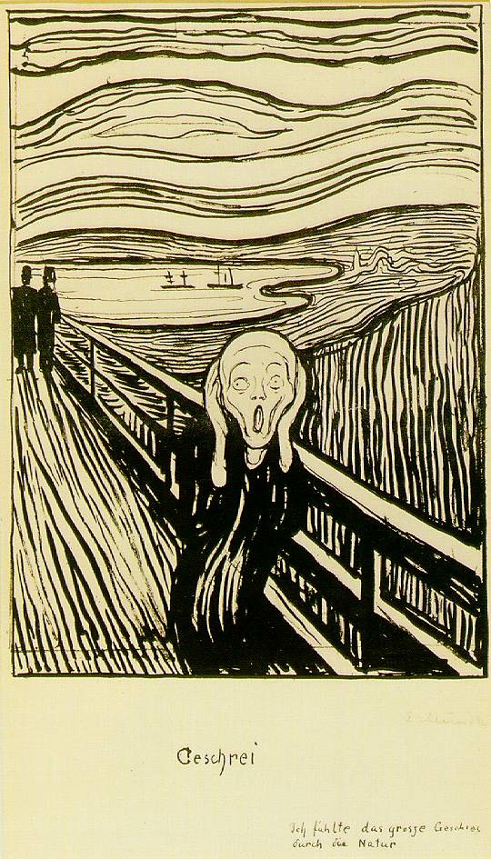 蒙克以现实生活为依据,凭借个人的家庭经历与朋友的遭遇,选择用象征和隐喻手法,揭示了“世纪末”人的忧虑与恐惧,这幅《呐喊》便是组画中最负盛名的代表作。关于这幅作品的创作过程,画家曾记述道:“一天傍晚,我和两个朋友一起散步。太阳下山了,突然间,天空变得血一样的红。在灰蓝色的峡湾和城市上空,我看到了血红的火光。我的朋友走过去了,只剩下我一个人。我在恐怖中战栗起来,似乎感到大自然中传来一声震撼宇宙的呐喊。于是我画了这幅画,并把云彩画得血一样红。”此画描绘一个面容近于骷髅的人物,双手捂着耳朵,站在一条看不到头尾的公路桥上,似乎受到惊吓而大声狂喊。画家用近似版画的方式,把红、蓝、绿、赭等色线,组成流动的河水与天空的形象。这些线条像浮在油上的色渍,变成蠕动的蛇虫,给人以强烈的不安感。这种景象只能在恶梦中看到,它象征“世纪末”时代人们的彷徨心理。