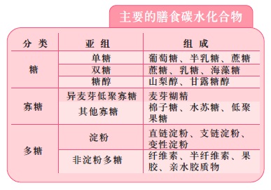 多糖主要是淀粉和纤维素,淀粉是人类膳食碳水化合物的主要形式。谷类、薯类等植物中都有充足的淀粉。纤维素与淀粉一样,也是多糖,所不同的是纤维素的结构呈直线型,而且氢键很多,相当牢固,即使在加工条件下,植物细胞壁的纤维素也不会溶解。主要的膳食碳水化合物见下表: