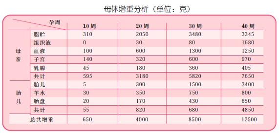 美国国家科学院食品与营养委员会经研究得出的结论是:孕妇足月分娩前,体重增加9~11千克较为安全。足月胎儿平均重3.5千克,胎盘重0.5千克,其余均为母体增重(总血量增加1.3千克。其中有 0.9千克羊水,乳房充盈0.4千克脂肪,作为热能贮存,以供分娩和哺乳所需)。孕妇体重增加的速度和增加量同等重要。在怀孕头3个月,体重增加应为0.5千克,中间4个月增加体重为5.5千克,最后两三个月约为5千克。如果在头3个月中体重增加不够的话,那就看是否有失眠或厌食的症状,如果其他都正常,那就不必为体重增加不足而担心。可在一天中多次进餐,多食健康食品,适当多饮牛奶、果汁。如果在孕期体重增加过快、过多,那很可能是因为吃得过多,参加锻炼过少或怀上双胞胎的原因。因此,孕妇应经常测量体重,根据体重增加的情况控制饮食,多吃蔬菜、水果等热能低的食物,代替一部分主食,力争不要使每周体重增加量超过0.4千克。