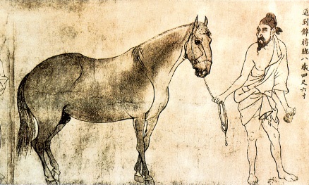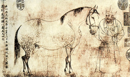 李公鱗(1049-1106).字伯时,号龙眠居士,舒州(今安徽舒城)人。道释、人物、鞍马均擅长,发展白描画法,行笔如行云流水。传世作品有《五马图》、《临韦偃牧放图》。本图是最具代表性的李公麟传世真迹,画中虽无名款,但作者生前至交黄庭坚的笺题和后跋,足以证明它的真实性。画为长卷,共分五段,皆以线描勾成,线条流畅简括,施以极清淡的颜色辅助,含蓄地表现丁人物的民族特征和马的神态。《五马图》以朴实的肖像形式给人一种亲切感,对后世影响甚大,成为后世鞍马人物画的最佳范本。