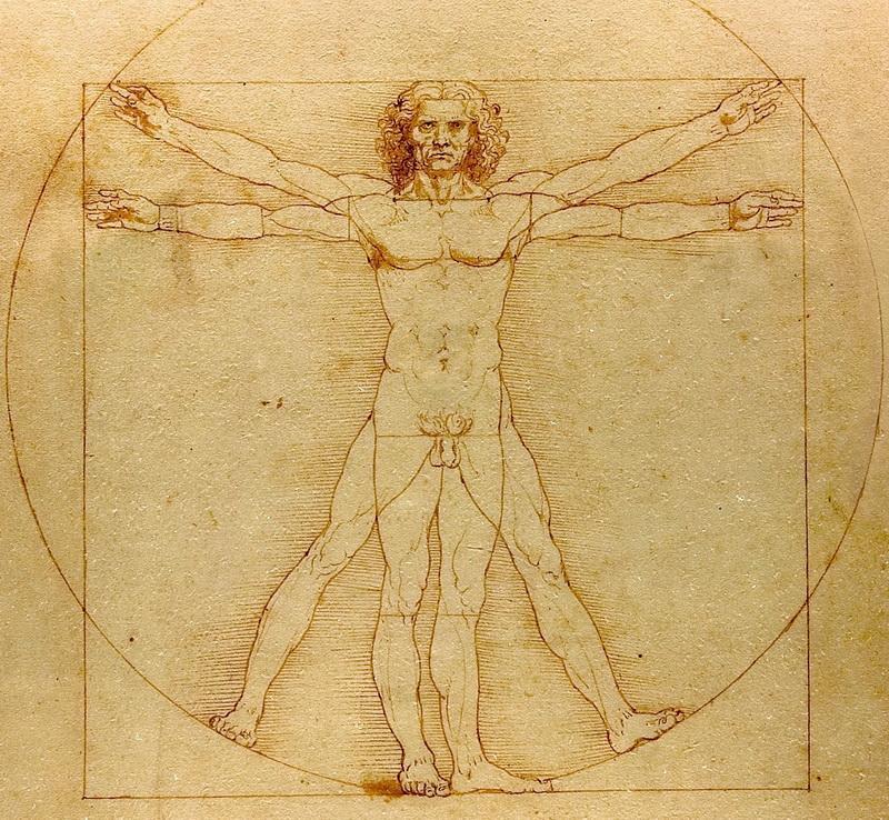 《维特鲁威人》是一幅达芬奇依照维特鲁威定律所作的钢笔画素描,画在一张13.5×9.5英寸的纸上,现藏于威尼斯的学院美术馆。之所以藏在威尼斯,大概是因为弗拉·乔康多于1511年在威尼斯印刷了关于维特鲁威的作品的对开本,里面有一张依照这幅素描所作的版画。素描的上面和下面都是手写的小字,画中描绘了一男子,他摆出两个明显不同的姿势,这些姿势与画中两句话相互对应。第一个双脚并拢、双臂水平伸出的姿势诠释了素描下面的一句话:“人伸开的手臂的宽度等于他的身高。”另一个叠交在他身后的姿势是将双腿跨开,胳膊举高了一些,表达了更为专业的维特鲁威定律:如果你双腿跨开,使你的高度减少十四分之一,双臂伸出并抬高,直到你的中指的指尖与你头部最高处处于同一水平线上,你会发现你伸展开的四肢的中心就是你的肚脐,双腿之间会形成一个等边三角形。画中摆出这个姿势的男子被置于一个正方形中,正方形的每一条边等于24掌长,而正方形被包围在一个大大的圆圈里,他的肚脐就是圆心。这幅素描中所画的男子形象被世界公认为是最完美的人体黄金比例。