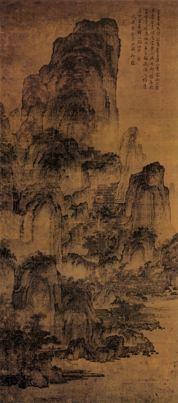 燕文贵(967-1044),北宋山水画家,吴兴(今浙江湖州〕人。擅山水人物,所画景物清润秀雅,常把山水与界画相结合,在其间缀以人物活动,刻画精微。在此图中,画家以浓重的粗线条勾画山石轮廓,皴笔多变化.表现出山石的坚硬与凹凸,画树趋于简率,具有一种率真自然的情态,加上画家的界画楼台并不呆板,自抅一格,帔人誉为“燕家景”。
