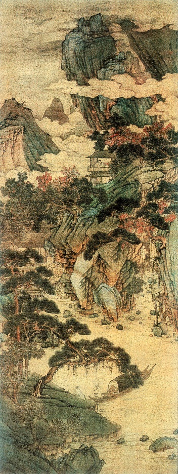 沈周(1427-1509),号石田,长洲(今江苏苏州)人。绘画传自家法,兼师杜琼。擅长山水,亦工花卉、鸟兽。后人把他和文征明、唐寅、仇英合称“明四家”。传世作品有《庐山高图》、《落花诗意图》等。此图是沈周山水画中赋色比较重的一幅,还用了青绿山水画的表现技法,是他水墨浅绛画的典范。他善于运用传统手法描绘现实的生活实景。