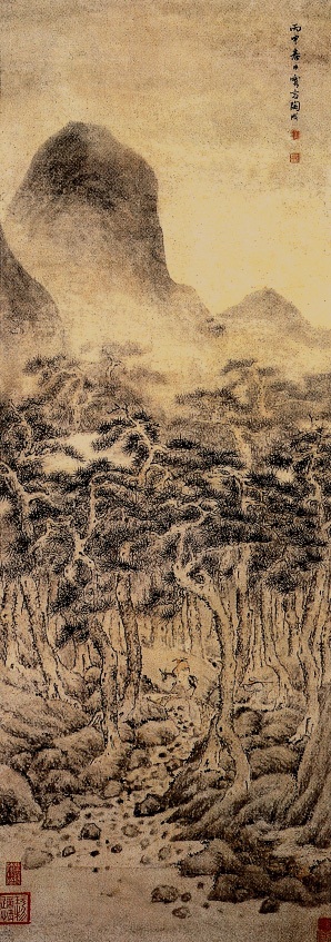 陶成,生卒年不详,宝应(今江苏宝应)人。擅长画山水、人物、花鸟。喜作勾勒竹及野兔、鹤、鹿等物,神态皆妙。此图绘高山远峰,松林郁葱,林间溪水淙淙,小桥横列 ,有人策马缓行于桥上,后有仆人挑担随从。用笔苍郁,意境幽远。