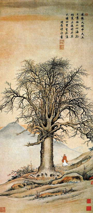 项圣谟(1597-1658),秀水(今浙江嘉兴)人。擅画山水,初学文怔明,远法宋人,取法于元代诸家。此图绘古树一株,参天独立于旷野之上,一老者拄杖遥望远山。形象生动,构图独特。幅上题诗曰:“风啸大树中天立,曰薄西山四海孤。短策且随时旦莫,不堪回首望菰蒲。”