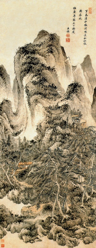 王鉴(1598-1677),明末清初画家,江苏太仓人,王世贞孙。擅画山水,笔法圆浑,用墨浓润,摹古尤精,与王时敏齐名,为清初六大家之一。王鉴与王时敏的画风虽同为摹古一派,但王鉴并不偏于黄公望一家,他选择传统图式的范围要宽一些。此图为仿王蒙画法,描绘苍松峻岭中的书馆和周围宁静险峻的自然环境。画面当中景物繁密,远近层次分明’笔法圆浑,用墨浓润。