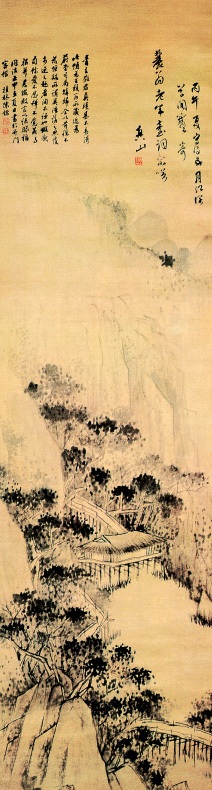 傅山(1607-1684),明末清初的书法家、学者、医学家。阳曲(今山西太原市)人。他能画山水,风格古拙奇特;又擅书法,工篆、隶、楷、行、草诸体,尤精于草书。此幅画杜甫诗意,笔致古拙,敷色妍丽,笔墨简劲,风格独特,颇有风趣。应是画家的上等精品。