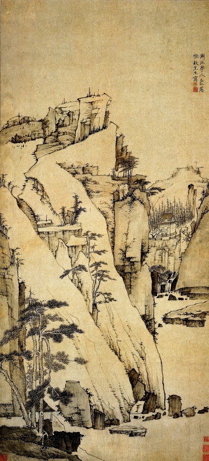 弘仁(1610-1664),本姓江,名韬,安徽歙县人。清顺治四年(1647年)出家为僧,法名弘仁。工画山水,兼工画梅。山水风格近黄公望,而受倪瓒影响最深,笔墨瘦劲,风格冷峭。与汪之瑞、孙逸、查士标为“新安派四大家”。此图在笔墨运用上,取法于黄公望、倪瓒之间,而自有面貌。山石尚简,用干笔淡墨勾勒,线条爽利,少皴擦而有山石方硬的形体 ;作品布局精密,结构严谨而无板滞之感,得风神懒散、气韵荒寒的奇致。