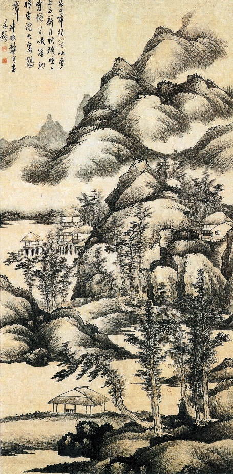此图气势恢弘,浑厚苍秀,用笔方折,用墨层层染渍,使山峦变幻莫测,意境幽远。画中自题:“谷口峰根尽吐云,上方新月映残曛。今霄预有吹笙约,盼望诸天鸾鹤群。”