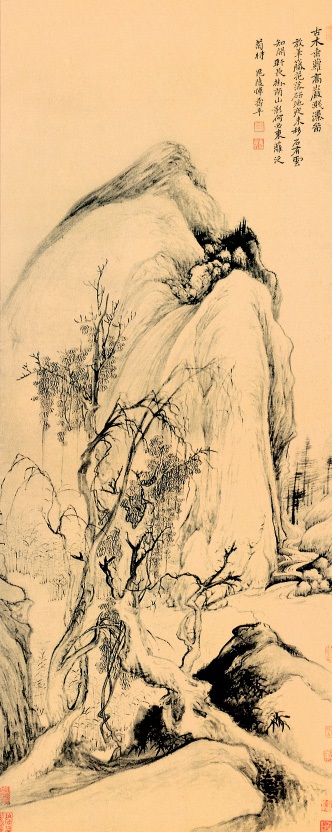 恽寿平(1633-1690),初名格,字寿平,号南田,武进(今江苏常州)人。初写山水,后改作花卉,其作品色调清新,雅秀超逸,独开生面,为“清六家”之一。虽然他在花鸟画上的名誉胜过山水画,但也是一个有成就的山水画家。此图为仿古之作,章法严谨,笔墨沉稳,山石画法受董源及吴镇山水画的影响,皴法朴厚苍浑,树木、藤枝、芦苇用笔尖细劲利,风格灵秀生动’技法灵活多变。该作品是恽寿平中年山水画的代表作。
