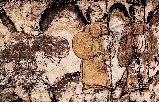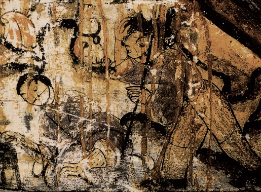 此图表现了楚汉相争时,谋士范增设鸿门宴要杀掉刘邦的场面。整个作品用寥寥数笔勾勒出人物的动作、神情、姿态以及背景,加以渲染概括,使人物形象刻画比较生动,场面富有戏剧性。