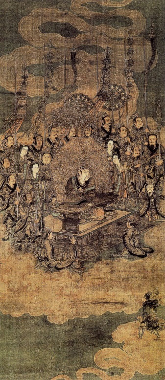 天官、地官、水官是道教美术中经常表现的题材。此图从构图和风格上看,应是南宋时期的作品。造型、线条以及运动感都有唐代吴道子遗韵。整组人物立于五彩祥云之上 ,以表明天的性质。