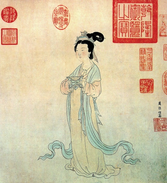 周朗,生卒年不详,元顺帝时人。擅画马,亦工仕女画。《杜秋娘图》是他仅见的传世之作。此图以唐代杜牧所作《社秋娘诗》为题材,画面上杜秋娘梳高髻、着长裙、手执排箫、独立凝思,人物面相丰润,具唐妆仕女特征,线条兼取唐人张萱、周昉的琴弦描和吴道子的兰叶描 ,匀劲流畅。而设色淡雅,不同于唐代的重彩法,恰当地表现了这位歌舞妓的淡泊人生。