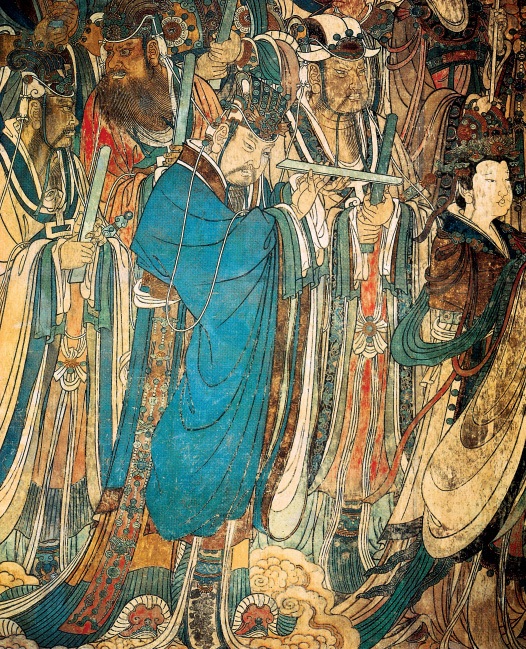 永乐宫为元代初年道教全真派得势时建造,宫殿规模宏伟,沿中轴线建有龙虎殿、三清殿、纯阳殿、重阳殿等。《朝元图》是三清殿里的壁画。此图是其中一部分,也是永乐宫中具有代表性的一个画面。