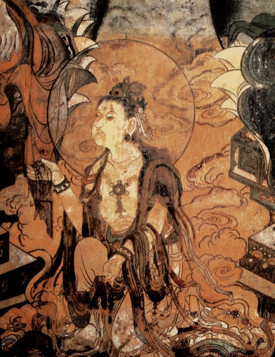 此图为《七佛图》中左起第六佛与第七佛之间的菩萨,右手托物,左手持练,作半跪式。菩萨服饰华美,面相秀丽。