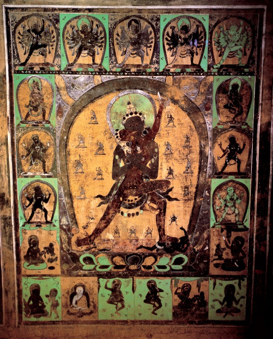 释迦牟尼佛为调伏欲界众生而显示的双身像之一,俗称之为欢喜佛。主尊周围布满富有印度、尼泊尔风格的各种化生相,动作富有舞蹈节奏感。赋色艳丽,装饰性很强,是元代早期受西藏喇嘛教影响的题材。