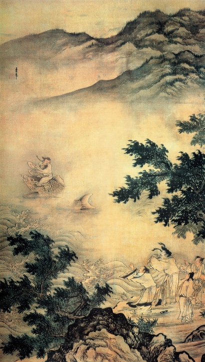 李在(?-1430),福建莆田人。擅长画人物,工山水,其山水师郭熙和马远、夏圭。此图是传世名作。在画法上,属细笔人物山水,是一幅情韵高尤而优美动人的作品。