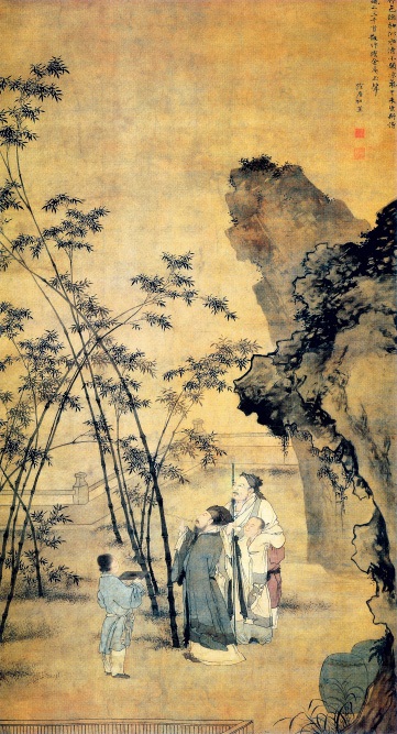 此图画东坡题竹的故事。画面正中高帽长.须,执笔题竹者为苏较,左侧一童子端现侍候,右侧一老一少正在聚精会神地观看。人物衣纹作兰叶描,纤细而有力,山石勾皴随意,和人物笔法造成松紧对比,此画糅宋人的工整严谨与元人的秀润清雅于一体。
