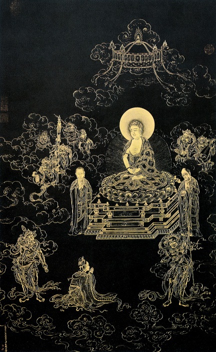 此图虽题无量寿佛图,其实应为如来佛图。用金粉画佛像,面容慈祥,端坐于莲台之上,左右为阿难、伽叶两大弟子,旁有四大金刚,哼哈二将,前有一女信徒拜谒。线条流畅、工细,佛像及莲台用晕染法显出凸凹之感。