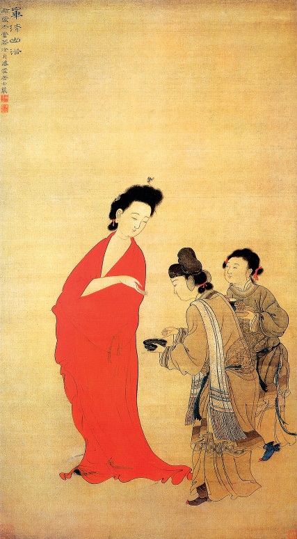 此图以杨贵妃出浴为题。图中杨贵妃身披纱衣,身姿婀娜。人物用笔工整细致,线条圆润流畅,设色工细、讲究,人物造型准确,用笔虽细却无媚俗之感。