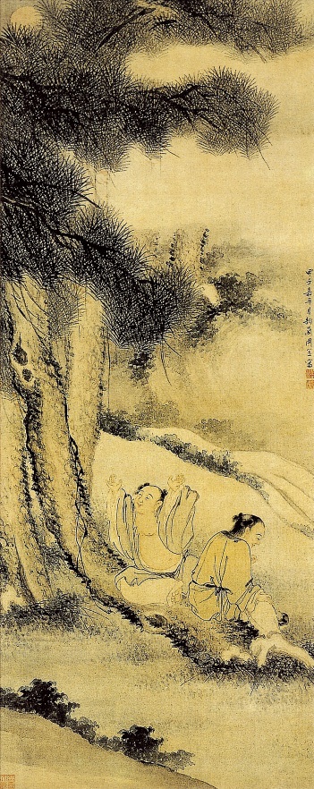周笠,生卒年不详,活动于乾隆、嘉庆年间,江苏吴县人。早年擅肖像、仕女,中年后改花卉、仕女。此图写松下两童子,着宽袍坐于树根,一袒胸抬头张开双手似有所见,一俯首逗弄鸟雀。形象生动有趣,线条疏简,笔意秀润 。
