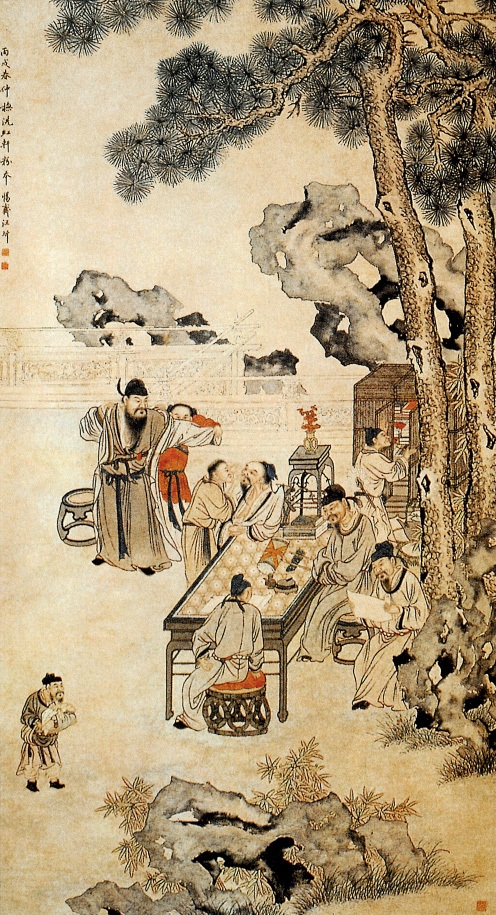 作者生平不详。此图以宋代苏东坡等五学士聚在一起品评诗文为画题。以工笔写人物,水墨晕染,山石以没骨法画出。人物衣纹流畅、造型各具情态,均生动传神,表现了文人们的高雅兴致。