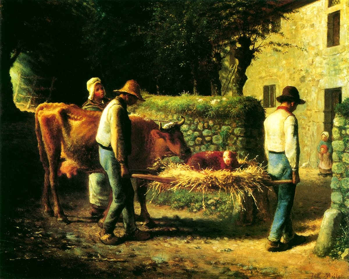 这幅金色的画面闪耀的让人有些睁不开眼睛,两个农夫担着刚出生的牛犊正朝他们的乡村庭院走来。他们身那边的一个农妇,头缠一块白色的丝巾,她手牵着母牛的绳子给牛的身子挡住了。母牛一边走一边用舌头舔着自己的牛犊。牛犊安静的坐在两个农夫抬着担架的麦草上,它刚刚来到这世界,大概一双眼睛还没有睁开过。这座乡村庭院的墙内和墙外生长着茂盛的树木,浓密的树冠遮盖了农舍的屋顶,使门两旁的墙头上长满的青草。现在两个农夫担着牛犊即将走进乡村的庭院,他们身穿橄榄色工装裤,头戴着褐色草帽一前一后沉浸在添畜加口的喜悦里,一束透过树荫的夕阳似乎也沉醉了。而庭院中玩耍的两个女孩并不知道这个下午发生了什么,她们立在庭院的门口,大女孩怀前揽着那个小女孩正用金子涂抹自己的童年。