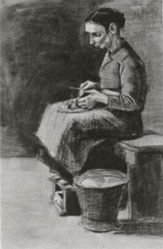 以家庭生活为背景的画,别说同样具有象征性的内涵,看上去似乎并非更深刻、更有魅力。光线洒入室内,落在瘦骨嶙峋的人物和简单粗笨的陈设上。一个瘦弱的女人在削土豆——这是穷人的主食。