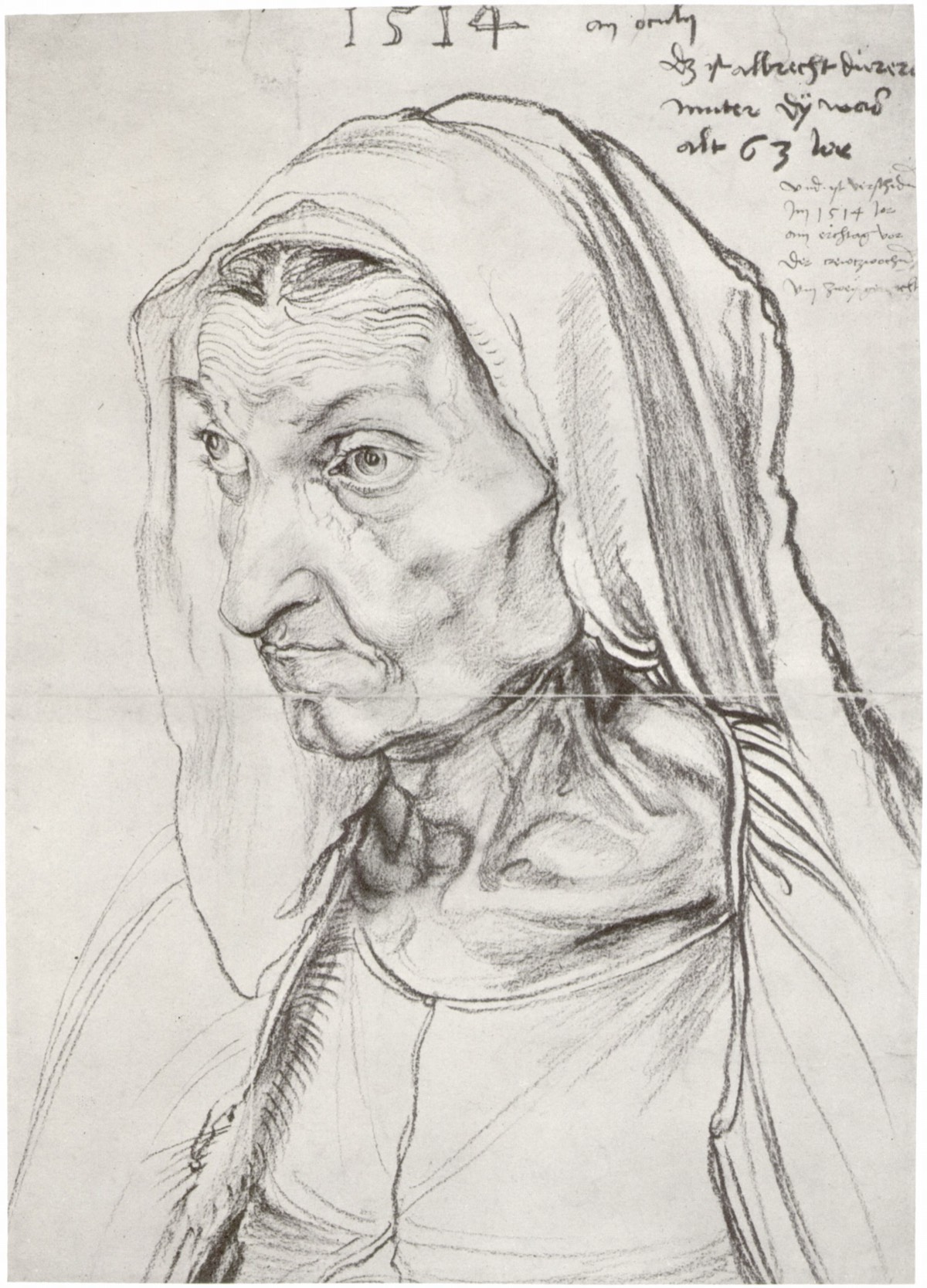 这幅木炭素描《母亲肖像》是此类肖像素描中最富感情的作品(42×30厘米)。丢勒怀着对母亲的深厚感情,用简率的炭条,正确地勾勒出年迈多病的老母亲形象。她已风烛残年,历尽苦难,备受风霜的侵蚀,脸上留下了许多生活的印痕。她那隆起的颧骨,布满皱纹的前额、稍鼓的眼珠、尖长的鼻梁和薄而紧闭的嘴唇,这一切细节是画家真挚的感情流露,由于岁月的磨损,老人的脸庞不仅消瘦,还暴起了道道青筋,唯有一对眼睛依然炯炯有神。