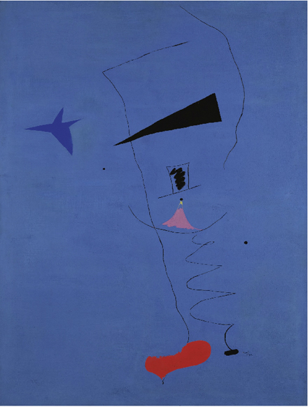 《蓝星》的形式内容非常简单,象征性的物体和单纯流淌的线,精细、随意、浪漫、抒情,仿佛音乐一般。米罗把颜色浓缩为蓝、黑、红,三个不同颜色的物象构成了画面中有生命的、游动的主体,尽管我们不能肯定这些主体是否有生命。它们既像海底的浮游物,又像天空中闪烁的星辰,而归根结底,这种空灵却是思想可注入的空间,是可供栖息的安宁。