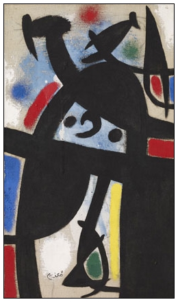 米罗在作画之前,先将画布的底部做摩擦的处理,可以隐约看见背景的草图与线条,让它产生多重的效果,虽然处理画布过程中可能难以预料,但反而让